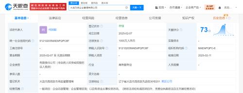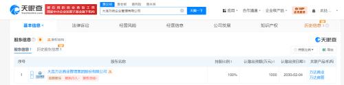 天眼查App显示,近日,大连万统企业管理有限公司成立,法定代表人为何其聪,注册资本1000万人民币,经营范围为企业总部管理、企业管理咨询、以自有资金从事投资活动。股东信息显示,该公司由大连万达商业管理集团股份有限公司全资持股。值得一提的是,大连万达商业管理集团股份有限公司近期还成立了大连万虹企业管理有限公司,后者注册资本为1000万人民币。