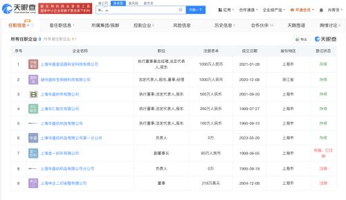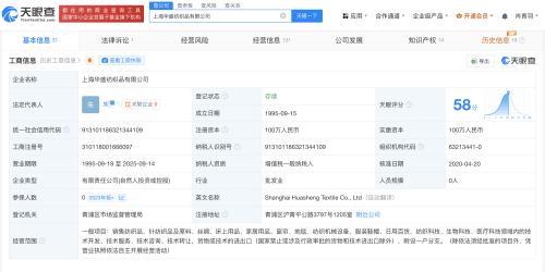天眼查App显示,上海华盛纺织品有限公司成立于1995年9月,注册资本100万,由朱某某担任法定代表人、执行董事,并持股75%。商业履历信息显示,朱某某名下共关联9家公司,其中6家为存续状态,包括上海华盛皇冠面料宝科技有限公司、湖州面料宝网络科技有限公司、上海华盛织布有限公司、上海华仁制衣有限公司等,朱某某在上述企业担任执行董事兼总经理、法定代表人、股东等职务。