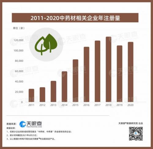 从发展趋势来看,近十年,中药材相关企业数量持续上涨,增速一直维持在10%以上。其中,2016年,年增速达到23%,为历史最高,2018年新增中药材相关企业超过12.6万家,为增量最多的年份。此外,截至6月25日,2021年新增中药材相关企业超过3万家。