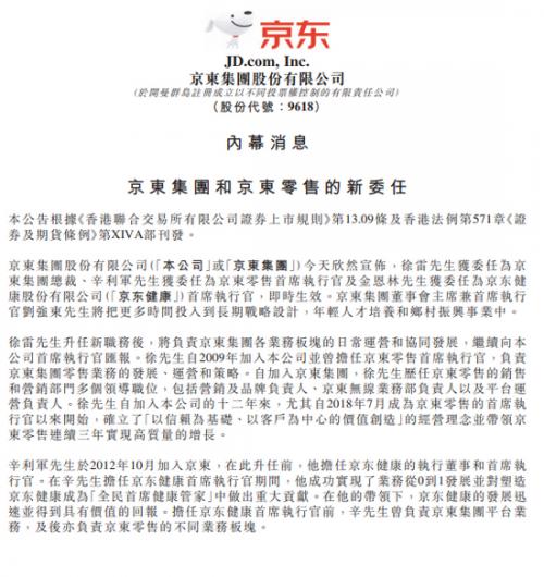 9月6日消息,今日,京东集团在港交所发布公告,公布了部分人员职位变动。