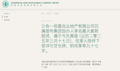 恒基兆业地产有限公司发布讣告,集团创办人李兆基3月17日黄昏在家人陪伴下逝世,享年97岁。