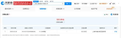天眼查App显示,近日,上海汇浦信息技术有限公司新增1条欠税公告,欠税税种为个人所得税,欠税余额为523.09元。