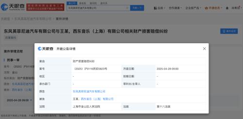 天眼查App显示,近日,东风英菲尼迪汽车有限公司与西东音乐(上海)有限公司、王力宏相关财产损害赔偿纠纷案件新增开庭公告,原告为东风英菲尼迪汽车有限公司,该案将于4月28日在上海市金山区人民法院开庭审理。