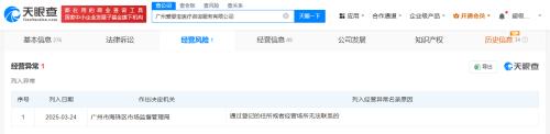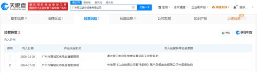 天眼查App显示,近日,涉事的广州爱婴宝医疗咨询服务有限公司、广州君兰医疗设备有限公司因通过登记的住所或者经营场所无法联系,分别被广州市海珠区市场监督管理局、广州市增城区市场监督管理局列入经营异常名录。