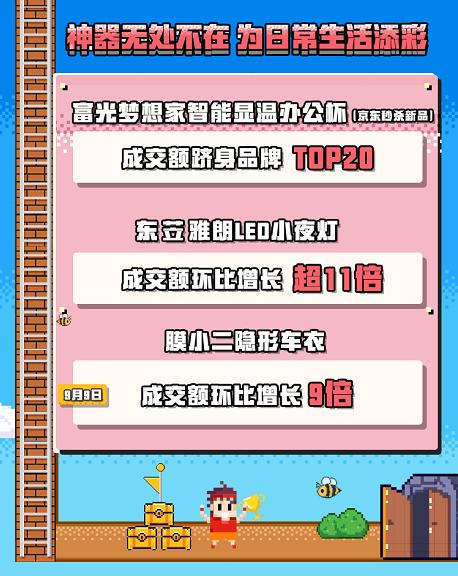 此外,京东秒杀通过对当下细分消费趋势分析,挖掘超级工厂货,以超值品质、优惠价格满足消费者需求。9日当天,千禾酱油料酒组合成交额环比增长近16倍,健康美味同时拥有,快乐加倍;膜小二隐形车衣成交额环比增长9倍。9-11日三天,东苙雅朗LED小夜灯成交额环比增长超11倍;巨香荞麦面环比增长9倍。