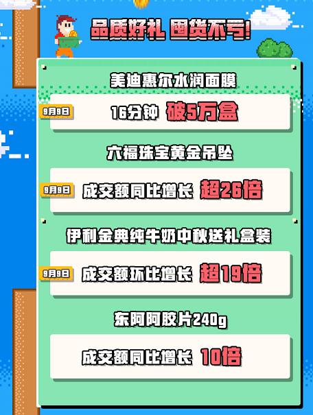 双节来临之际,大牌礼盒囤起来,送家人送朋友倍有面儿。在9日当天,美迪惠尔水润面膜16分钟破5万盒;科颜氏净澈舒缓礼盒,成交额环比增长超20倍,让肌肤告别干燥;六福珠宝黄金吊坠成交额同比增长超26倍;如今人们的健康意识不断提高,也越发注重身体营养的补充了,伊利金典纯牛奶中秋送礼盒装成交额环比增长19倍,9-11日,东阿阿胶片240g阿胶块红标铁盒装成交额同比增长10倍。
