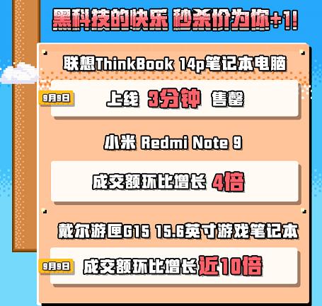 众多大牌数码好物也以超值价格被消费者收入囊中。9日当天,联想ThinkBook 14p笔记本电脑上线3分钟售罄,成交额环比增长超7倍;戴尔游匣G15 15.6英寸游戏笔记本成交额环比增长近10倍;9-11日,小米Redmi Note 9成交金额环比增长4倍。
