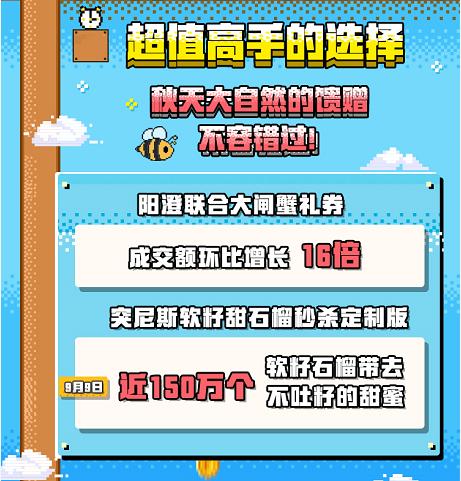 9月来了,中秋节、国庆节的步伐也近了,节日礼物也该准备起来了。京东9.9超级秒杀节带来多款应季好物,产地直邮的京东秒杀定制版的突尼斯软籽石榴,在9日当天就卖出近150万个,不但超级甜蜜还不用吐籽,是懒星人的最爱了;当季鲜美的大闸蟹怎能缺席,9-11日,阳澄联合大闸蟹礼券成交额环比近30天日均增长16倍!月饼作为传统节日美食代表,也受到了消费者的青睐,9日当天,月饼成交额同比去年农历同期增长136%,华美莲蓉蛋黄月饼礼盒在当天成交额环比增长近4倍。