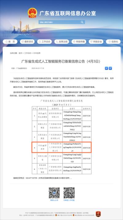 近日,广东省委网信办发布最新公告,公布了2025年4月3日新增的6款已完成备案的生成式人工智能服务。其中,由朴食科技独立研发的大模型成功通过备案,成为智慧食堂行业首个获批的大模型!这是智慧食堂领域的一大里程碑,标志着人工智能技术在营养健康领域的应用迈入新阶段。