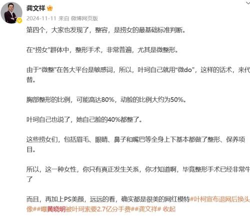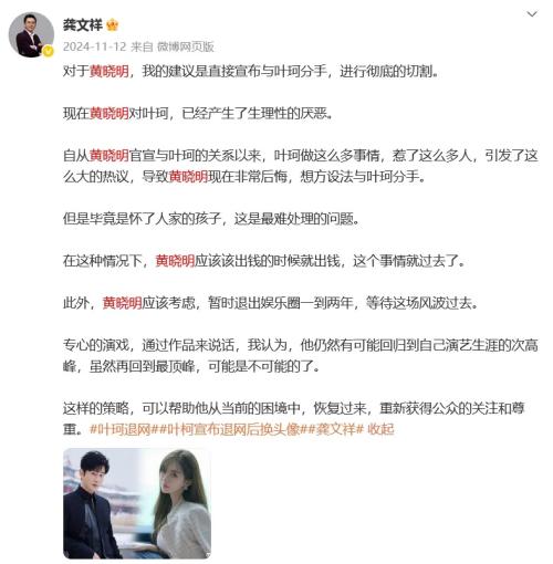 龚文祥自称全网600万粉丝,曾上过10次热搜。其微博粉丝超300万,曾在黄晓明叶珂陷入恋情风波时多次发文,提到“分手”“捞女”“生理性厌恶”等词汇。