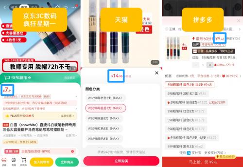 文具方面也存在差价的问题。白雪直液式白板笔(4支装)在京东3C数码“疯狂星期一”的价格为7.9元,在天猫的到手价高达14.9元,差不多相当于京东的2倍了;在拼多多的价格则为9.45元,京东价比拼多多的9折还低。