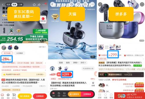 类似的还有黑鲨凤鸣无线蓝牙耳机,在京东3C数码“疯狂星期一”的售价为284.5元,同样支持使用国家补贴立省15%,而在天猫和拼多多的价格则为299元,还是京东更便宜。