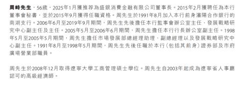 另外,盛京银行2024年年报披露,董事会秘书周峙已于2025年1月获推荐出任盛银消费金融有限公司董事长。资料显示,周峙现年56岁,自1991年加入盛京银行前身沈阳合作银行以来,历任市场发展部总经理助理、监事会办公室主任、发展战略研究中心主任等职,2015年起担任董事会秘书,主导公司治理与信息披露工作。