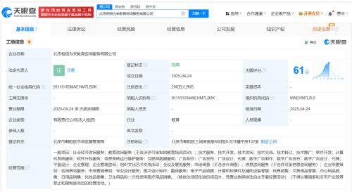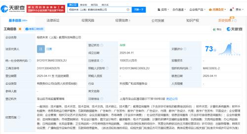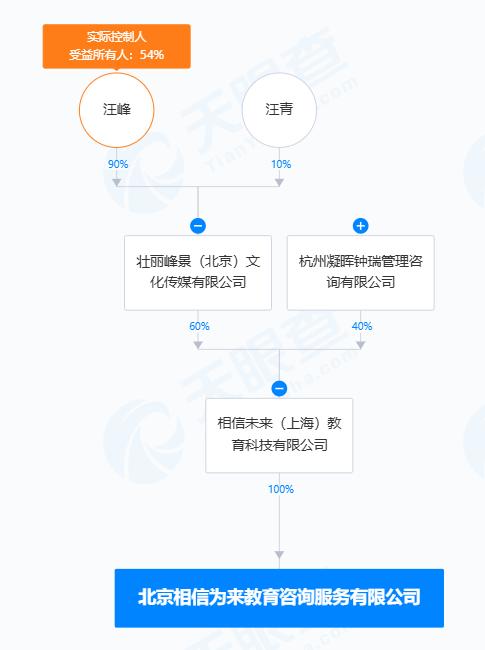 天眼查App显示,近日,北京相信为来教育咨询服务有限公司成立,法定代表人为汪青,注册资本200万人民币,经营范围包括社会经济咨询服务、软件开发、计算机系统服务、软件外包服务、信息系统运行维护服务、互联网数据服务等,由相信未来(上海)教育科技有限公司全资持股。值得一提的是,相信未来(上海)教育科技有限公司也于近期成立,注册资本1000万人民币,由汪峰名下的壮丽峰景(北京)文化传媒有限公司、杭州凝晖钟瑞管理咨询有限公司分别持股60%、40%。