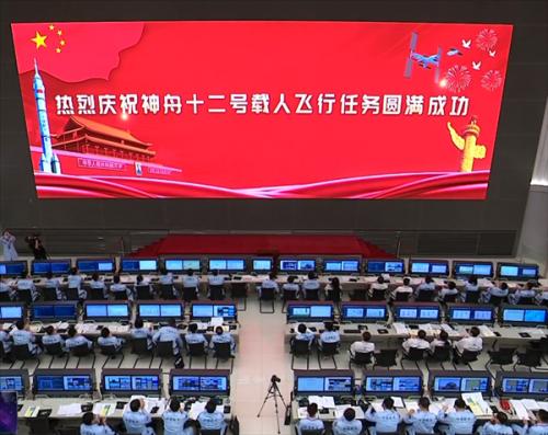 13时53分左右,随着北京飞行控制中心现场的一声口令,大屏幕上显示出“热烈庆祝神舟十二号载人飞行任务圆满成功”的字样,意味着我国空间站建造阶段的首次飞行任务圆满成功。