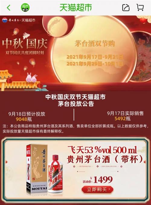 事实上,天猫超市茅台投放公告已于9月17日开始实行。