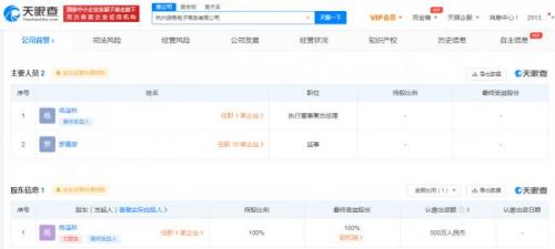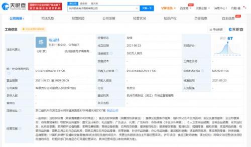 天眼查App显示,近日,杭州游良电子商务有限公司成立,注册资本500万人民币,法定代表人为练溢林,经营范围包括互联网销售;食品互联网销售;市场营销策划;演出经纪;网络文化经营等。股东信息显示,该公司由练溢林全资持股。