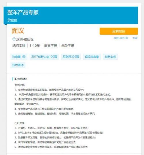 36氪独家获悉,货拉拉开始启动造车项目,目前已开始招募新能源货车制造方面的人才,包括新能源货车整车产品专家等职位。