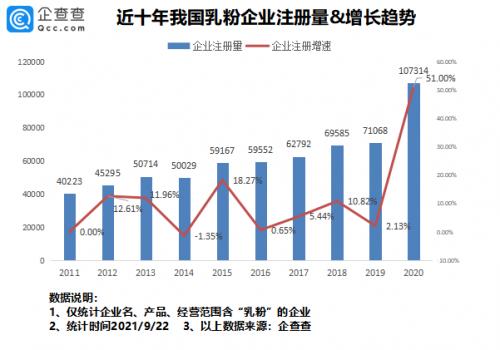 企查查数据显示,目前我国现存乳粉相关企业共88万家,2011-2020年我国乳粉相关企业注册量呈逐年上升趋势。2019年新增7.1万家,2020年是近十年新增乳粉企业最多的一年,新增10.73万家,同比增长51%。