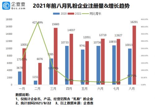 2021年前8月我国新增乳粉企业9.95万家。其中,3月新增乳粉企业1.57万家,同比增长115.28%。8月新增乳粉相关企业1.63万家,是新增乳粉企业最多的月份,同比增长62.7%。相比于2020年,2021年前8月乳粉相关企业注册量逐月上升。