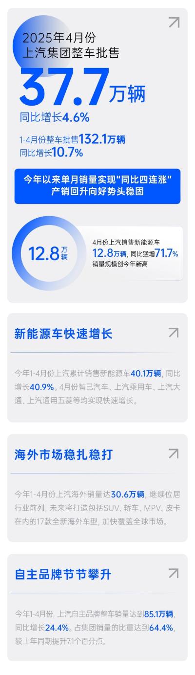 上汽集团今日宣布4月销售整车37.7万辆,同比增长4.6%;1-4月份整车批售132.1万辆,同比增长10.7%。今年以来单月销量实现“同比四连涨”。