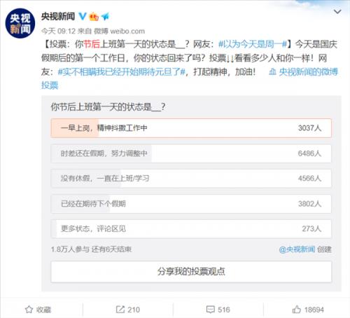 今天是国庆假期后的第一个工作日,#上班第一天#相关话题登上微博热搜。你的状态回来了吗?