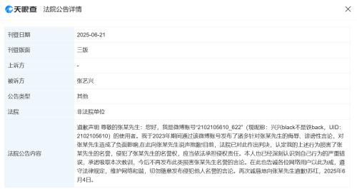 天眼查法律诉讼信息显示,近日,法院公开苏某向张艺兴的致歉声明。公告显示,苏某于2023年期间发布了诸多针对张艺兴的侮辱、诽谤性言论,对张艺兴造成了负面影响,目前,法院已对此作出判决,认定上述行为侵犯了张艺兴的名誉权,应当依法承担侵权责任。苏某表示其已经深刻认识到自己行为的严重错误,并承诺吸取本次教训,今后不再发布此类损害张艺兴名誉的言论。