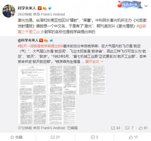 除了航空航天之外,航天员、导弹、火箭军等名词也是源于钱老,激光的中文翻译也是,网上大家看到过镭射等翻译,这是音译,激光则是意译,Laser本来就是缩写,本来就是受激辐射光放大的意思,钱老起的中文名更符合本意。