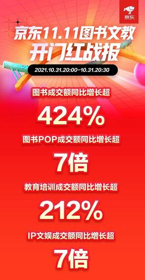 11月1日是京东图书11岁生日。京东11.11全球热爱季也在此前一天10月31日晚8点沸腾开启。由于不需要熬夜等待,京东11.11开启瞬间,海量消费者和订单涌入,大量品牌和商家迅速创造了新的纪录。开场30分钟,图书成交额同比增长超424%,图书POP成交额同比增长超7倍,教育培训成交额同比增长超212%,IP文娱成交额同比增长超7倍。沸腾热烈的图书销售,为京东图书的11周岁生日增添了喜庆。