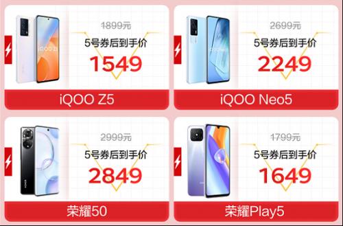 在千元档手机里,超高性价比的iQOO一直存在感很强。iQOO Z5,京东5号券后到手价1549元;iQOO Neo5, 5号券后到手价2249元;集华丽与高性能于一身的荣耀50,5号券后到手价只需2849元;适合送爸妈的荣耀Play5,无论性能还是性价比都相当出众,5号券后到手价1649元。