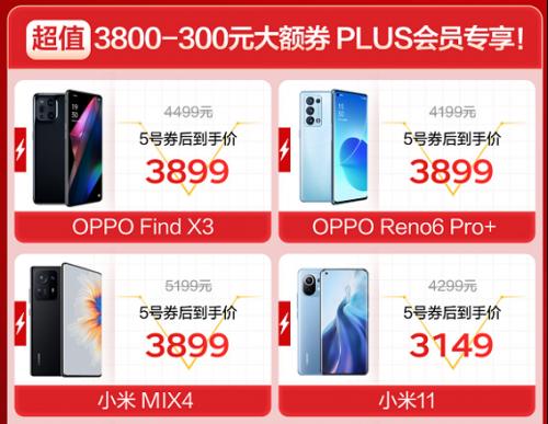 11月5日,PLUS会员还可领取满3800-300元大额券。在3000元以上的机型中,哪些机型更值得入手呢?在11.11开门红再创销量口碑新高度的OPPO Find X3,是爆款机型没差了,8+128GB版京东5号券后到手价3899元;焕采人像视频,自拍最美的OPPO Reno6 Pro+,5号券后到手价3899元起;治愈强迫症,全面屏的小米MIX4,5号券后到手价3899元;在同价位旗舰机型中始终保持超高性价比的小米11,5号券后到手价3149元。