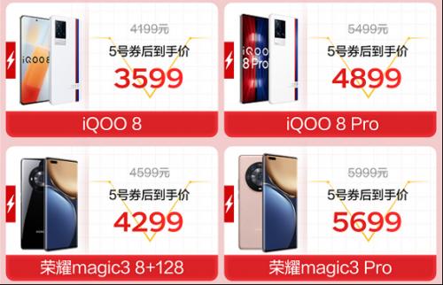 全感操控一触即发的iQOO 8,京东5号券后到手价3599元;iQOO 8 Pro京东5号券后到手价4899元;拥有极致影像的高能旗舰机荣耀magic3 ,8+128G版本5号券后到手价4299元;集合前沿科技的超高端旗舰荣耀magic3 Pro,5号券后到手价5699元。