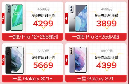 搭载影像系统中的天花板——一加哈苏影像系统的一加9 Pro 12+256G疗愈绿洲配色,京东5号券后到手价4299元;一加9 Pro 8+256G闪银版本,5号券后到手价3899元。能记录惊艳高光时刻的三星Galaxy S21+,适合学生党换新机,5号券后到手价5669元;三星Galaxy S21,5号券后到手价4399元。