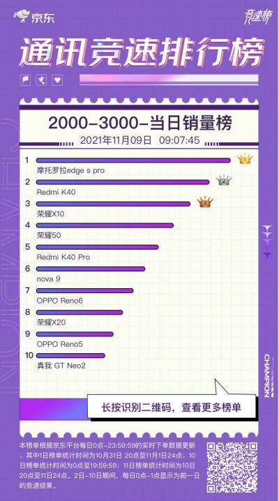 其中最抢眼的无疑是摩托罗拉edge s pro,这也是摩托罗拉回归中国市场之后的第二款5G旗舰。11月9日早上的数据,该机拿到了2000-3000元当日销量榜的第一名,紧随其后的是红米K40、荣耀X10、荣耀50等爆款。根据网友的口碑分析,用户普遍喜爱该机的骁龙870旗舰芯、Turbo LPDDR 5内存与Turbo UFS 3.1闪存、144Hz高刷与10亿色屏幕、1亿像素主摄与50倍变焦等配置,双11期间起步价只要1990元,相比同类配置的竞品都要便宜。