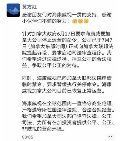 7月8日,海康威视首席合规官黄方红发文表示,“针对加拿大政府6月27日要求海康威视加拿大公司停止运营的命令,公司已于7月7日(加拿大东部时间)正式向加拿大联邦法院提起诉讼,要求启动司法审查程序。我们希望通过法律途径,捍卫公司的合法权益,争取公平公正的对待。”