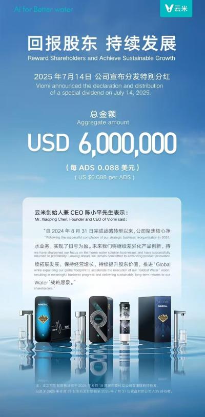 7月14日,云米宣布600万美元的特别分红,每ADS 0.088美元,创始人陈小平表示,自2024年8月31日完成转型以来,公司聚焦净水业务,实现扭亏为盈。未来将继续差异化产品创新,持续提升股东价值,推进战略愿景。