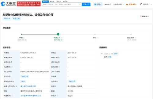 天眼查App显示,近日,赛力斯汽车有限公司申请的"车辆转向防碰撞控制方法、设备及存储介质"专利公布。摘要显示,该方法包括: 若车辆处于转向状态,则获取车辆状态数据,确定出车辆的当前盲区,并获...