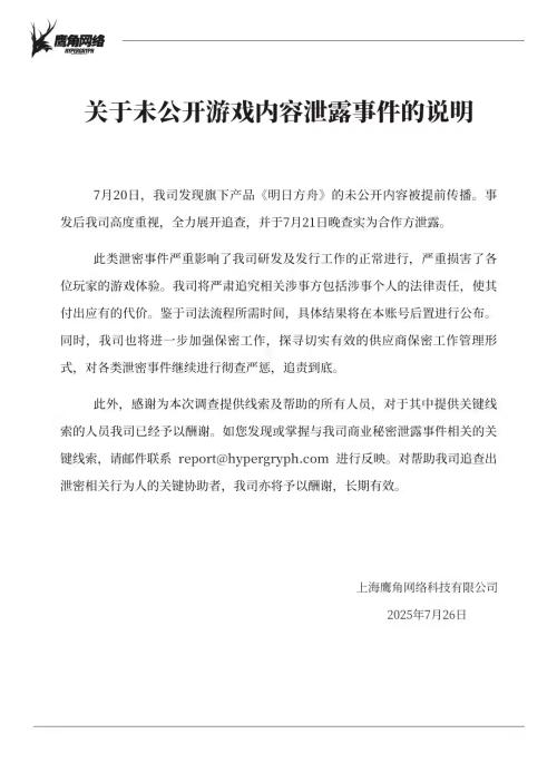 7月20日,我司发现旗下产品《明日方舟》的未公开内容被提前传播。事发后我司高度重视,全力展开追查,并于7月21日晚查实为合作方泄露。