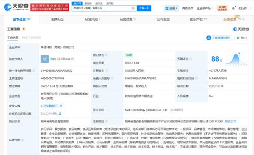 天眼查App显示,近日,库迪科技(海南)有限公司因通过登记的住所或者经营场所无法联系,被澄迈县市场监督管理局列入经营异常名录。该公司成立于2022年11月,法定代表人为张钧,注册资本1亿人民币,经...