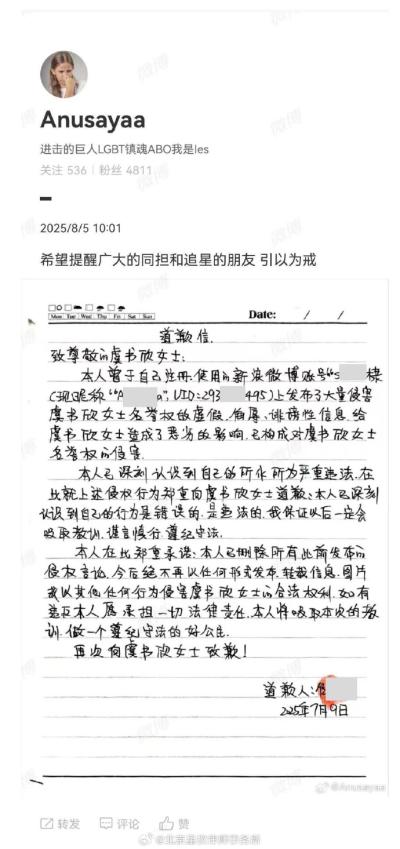 8月5日,受虞书欣委托律师事务所发布名誉权纠纷案件进展。2023年10月至2025年3月期间,被告侯某某使用涉案微博账号公开发布大量针对虞书欣女士的侮辱、诽谤性言论,涉嫌侵犯虞书欣女士的合法权益。法院依法判令:被告侯某某在涉案微博账号向原告虞书欣赔礼道歉,并赔偿原告虞书欣精神损害抚慰金及维权成本。截至2025年8月5日,被告侯某某已在涉案微博账号上公开发布致歉声明。