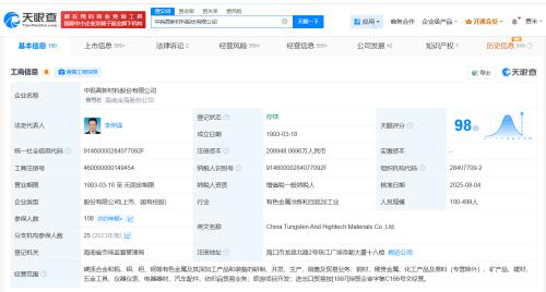 中钨高新材料股份有限公司成立于1993年3月,法定代表人为李仲泽,经营范围包括硬质合金和钨、钼、钽、铌等有色金属及其深加工产品和装备的研制、开发、生产、销售及贸易业务等。股东信息显示,该公司由中国五矿股份有限公司、五矿钨业集团有限公司、国新投资有限公司等共同持股。