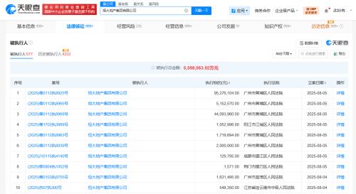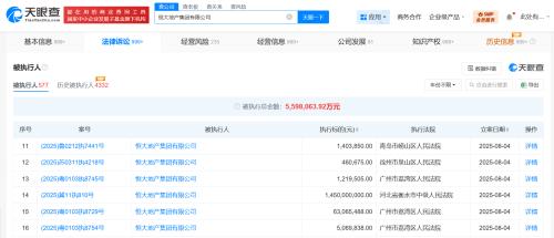 风险信息显示,恒大地产集团有限公司现存570余条被执行人信息,被执行总金额超559亿元,此外,该公司还存在多条限制消费令、失信被执行人(老赖)及终本案件信息。