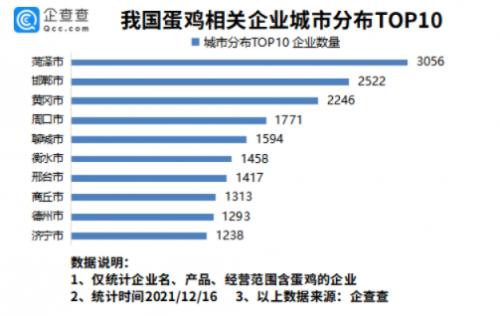 蛋鸡相关企业城市分布:菏泽最多,其次是邯郸、黄冈
