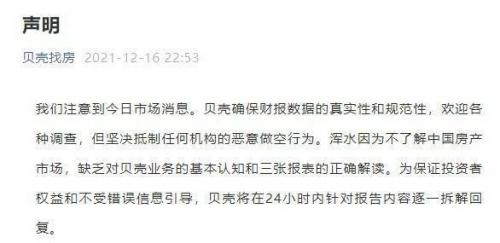 贝壳表示,“浑水因为不了解中国房产市场,缺乏对贝壳业务的基本认知和三张报表的正确解读。为保证投资者权益和不受错误信息引导,贝壳将在24小时内针对报告内容逐一拆解回复。”