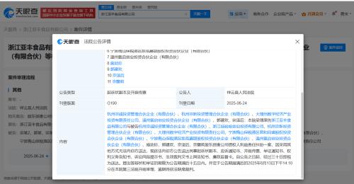 天眼查App显示,近期,祥云县人民法院公告送达原告浙江亚丰食品有限公司与被告宗馥莉母亲施幼珍、宗馥莉、宗馥莉叔叔宗泽后、浙江娃哈哈创业投资有限公司等股东损害公司债权人利益责任纠纷一案起诉状副本、开庭传票等,自公告发出之日起三十日即视为送达,该案定于8月13日下午14:10分在祥云县人民法院开庭审理。