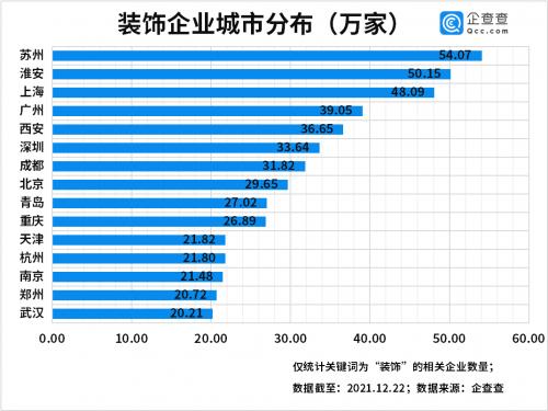 从城市上来看,企查查数据显示,江苏苏州和淮安的装饰企业均超过50万家排名前两位,分别有54.07万家和50.15万家,上海共48.09万家相关企业排名第三位。广州、西安、深圳和成都的相关企业数量排名靠前。