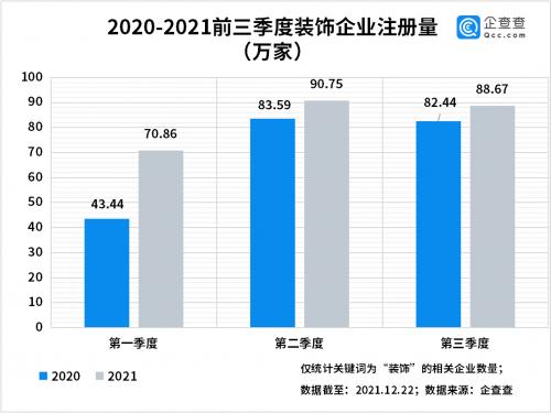 企查查数据显示,2021年前三季度共注册装饰相关企业250.28万家,同比增长19%,从季度来看,2021年第三季度共注册装饰相关企业88.67万家,同比增长8%,环比减少2%。