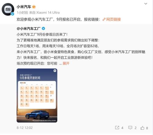 【科技快报网讯】8月16日,小米汽车官方宣布,位于北京经济技术开发区的71.8万平方米智能工厂将于9月全面开放参观,报名已开启,全月场次扩容至82场,创下该工厂开放参观以来的单月场次新高。