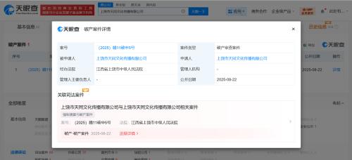 天眼查天眼风险信息显示,近日,RNG关联公司上饶市天同文化传播有限公司新增一则破产审查案件,申请人为该公司,经办法院为江西省上饶市中级人民法院。