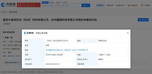 天眼查天眼风险信息显示,近日,虞书欣与愉悦区块(杭州)科技有限公司、杭州趣园科技有限公司新增开庭公告,原告为虞书欣,案由为肖像权纠纷,该案将于9月2日在杭州市上城区人民法院开庭审理。